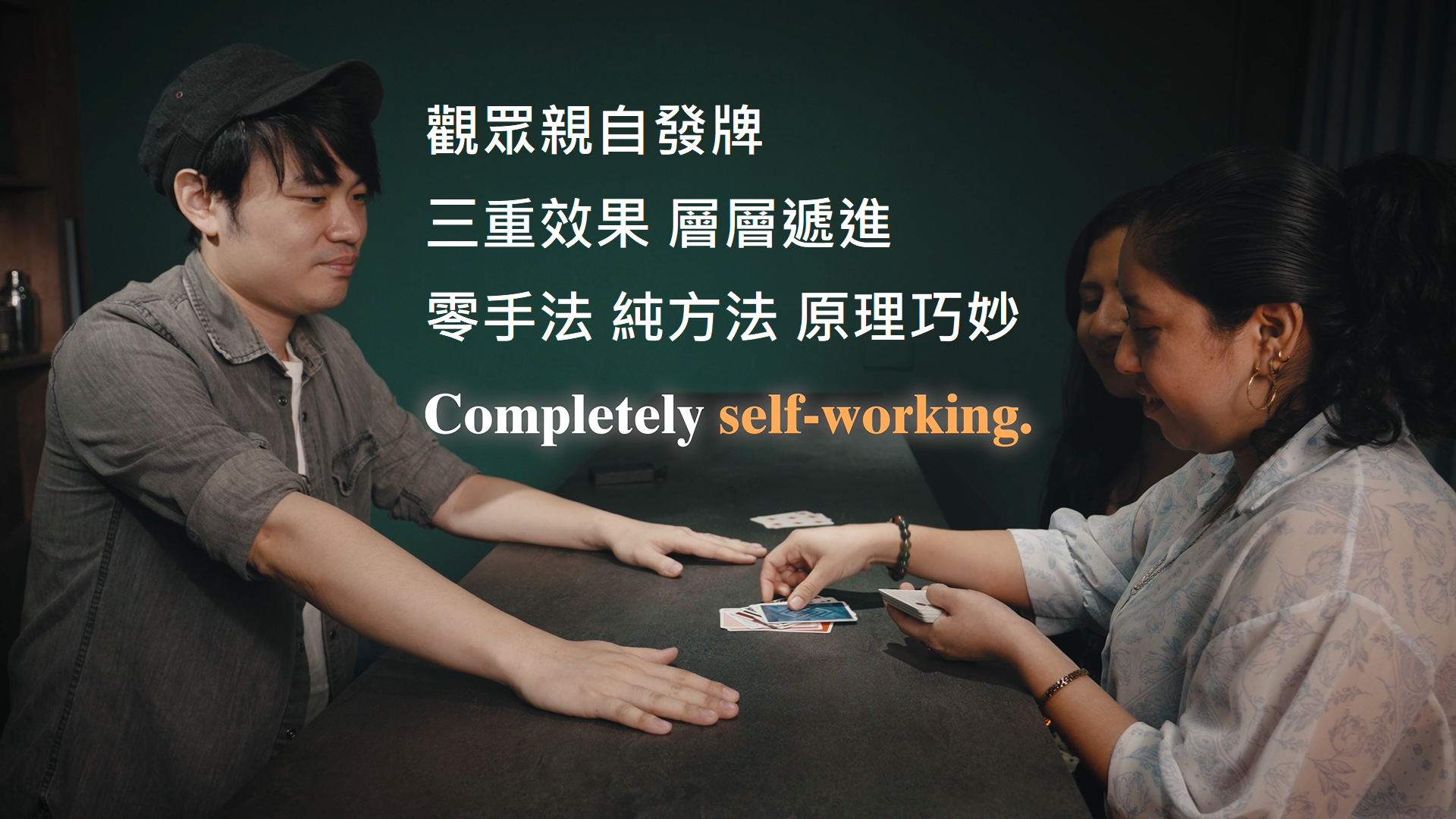 觀眾親手將兩張相同點數的紙牌,插入一副背面完全不同的牌堆中——隨意插入位置的兩張牌,相鄰的牌竟有著同樣的牌背設計,雖然顏色略有差異。但奇蹟才正要開始。